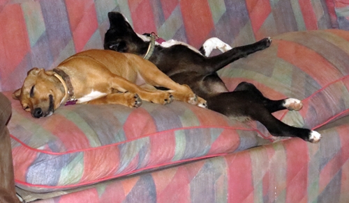 The vet figured that he had been poisoned and his liver was in bad shape. He also was blind in one eye. But after four months of pretty intensive treatment he is all well and looks great. He even got his eyesight back!! He and the two little ones wrestle all day long and now Thelma and Louise would not know what to do without Steggie.