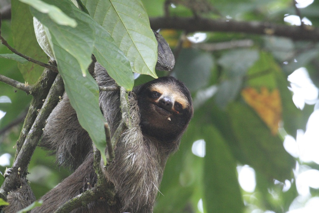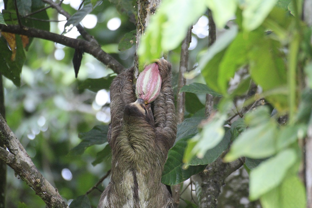 Young sloth eating a cacao pod
